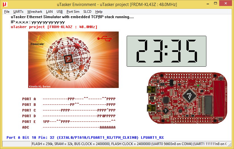 All UARTs (two LPUARTs and one UART) are using DMA for transmission. Read more details about the UART/LPUARTs in the KL43 at µTasker UART/LPUART interface.The application was configured with USB_INTERFACE to enable USB, USE_USB_MSD to enable the USB-MSD operation as well as USE_USB_CDC and #define USB_CDC_COUNT 3 for three CDC interfaces. The define FLASH_FAT is used instead of SDCARD_SUPPORT to specify that internal flash is used (the SD-card could be used in parallel with the SDCARD_SUPPORT define) and the following defines to control the location and size of the Flash area dedicated to the FAT: