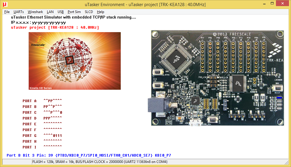 - uTaskerV1.4.8_BM_TRK-KEA128_8000.bin KEA128 application with command-line menu on the virtual COM connection. Connector pins J3-4 and J7-6 are configured as KBI interrupts (falling edge sensitive) and there is a message on the UART output on each edge. Low power modes can be set in the application menu and the processor runs at 40MHz [20.5k]. Linked to 0x8000, it can be loaded using the KBOOT PC tool. When the application is running the first blue LED blinks at 2.5Hz (the second blue LED indicates the amount of time the device is not in a low power mode during the operation).