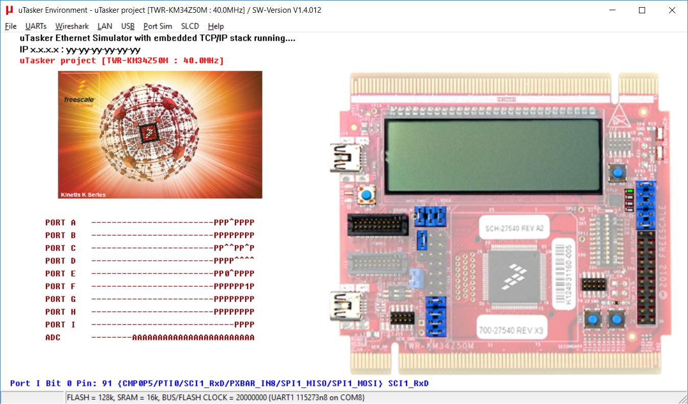 - uTaskerV1.4.12_BM_TWR_KM34Z50M_8000.bin TWR_KM34Z50M application operating at 40MHz with command-line menu on the virtual COM connection (115'200 Baud) with various menu items (as well as on UART1). When the application is running the green LED blinks at 2.5Hz [22.4k].