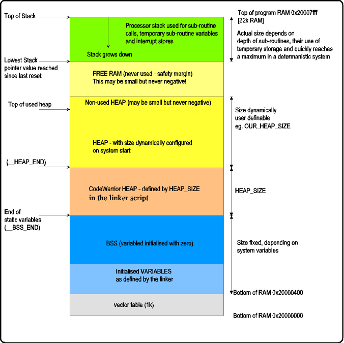 The GNU library code uses an external variable called void *__heap_limit to define how much memory its heap is allocated. If this value is not defined in the project it defaults to taking the memory range from the end of the bss section (extern unsigned char _end; as delivered by the linker – see the linker script file to see how this is made available) up to 256 bytes below the stack pointer. This means that it scales itself to use up all free memory leaving some for working stack (just don’t put anything on the stack which is larger than 256 bytes or it could corrupt memory!!!).