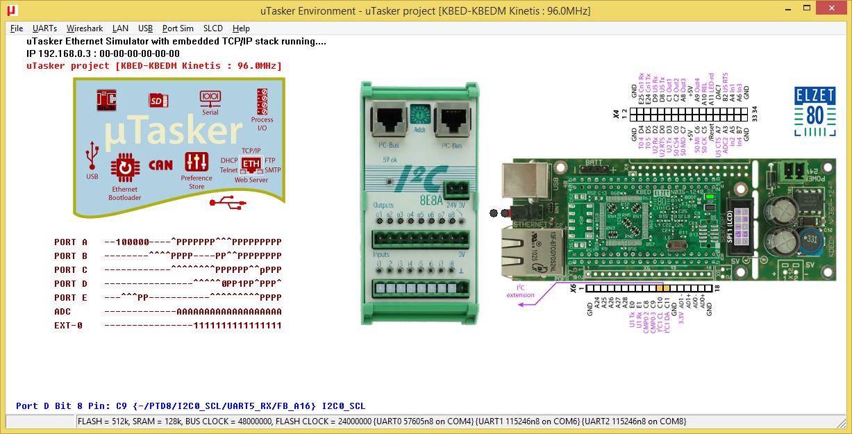 This board from ELZET80 is based on the K60 and comes with a range of extension modules such as the 8 input/8 output I2C module shown in the simulation.