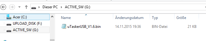 The following µTasker Serial Loader application configures for a USB-MSD device with two hard-drives as emulated FAT retrieving, deleting and loading firmware to the Flash Swap Block (second half of Flash) with a PC host. It uses USB_INTERFACE, USB_MSD_DEVICE_LOADER, SERIAL_INTERFACE, FAT_EMULATION and MEMORY_SWAP.One hard drive (named ACTIVE_SW) shows the present content in the main flash, where the program is operating (write-protected) and the other (named UPLOAD_DISK) shows the firmware stored in the swap block if it is present. By deleting any existing swap block code file and loading a new one, followed by a hard-drive "Eject" command, the two software versions are swapped by using the chip's swap mechanism. After a reset the new software runs and the previous software version is backed up in the swap memory. The two software version can then be switched again by repeating the eject command or else by commanding a swap on the UART interface (command "SW").