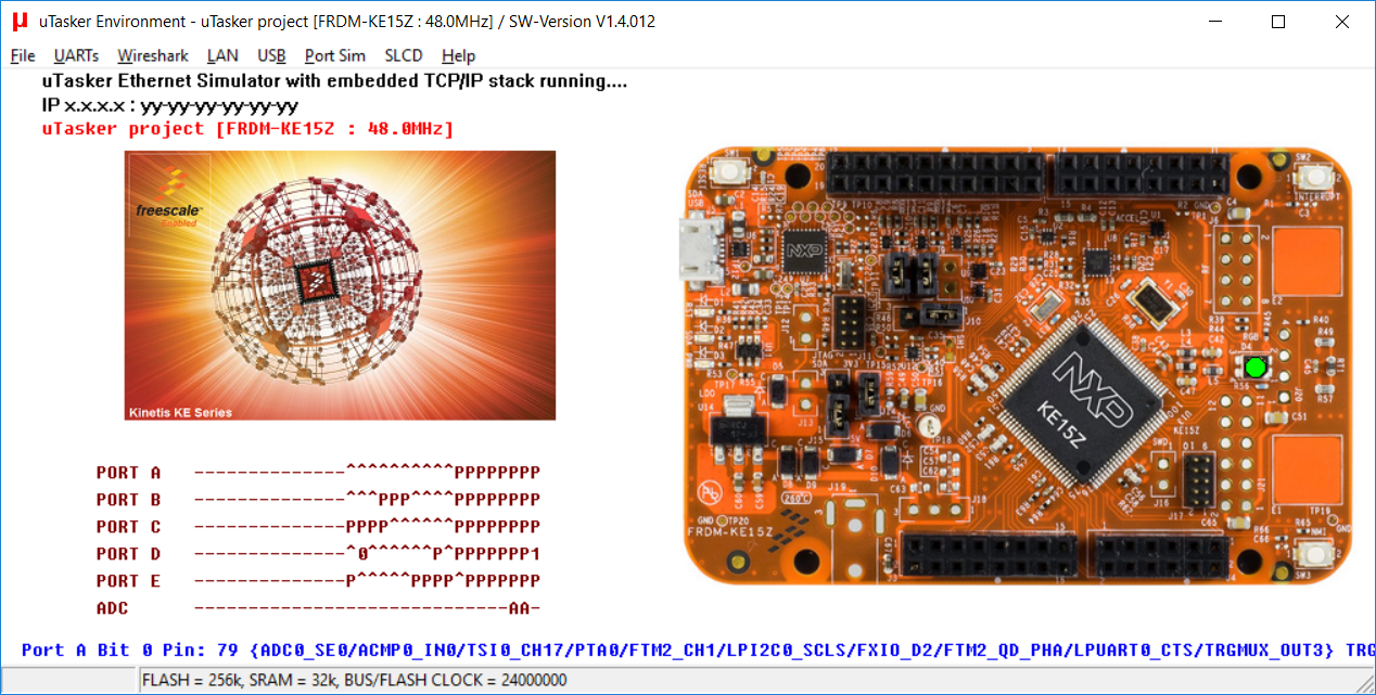Note that the loader limits application sizes to 40k - it can be built without limits using the µTasker project. - uTaskerV1.4.12_BM_FRDM_KE15Z.SREC KE15 application with command-line menu on the virtual COM connection allowing various functions to be tested [58.4k SREC content]. Linked to 0x8000, it can be loaded via the serial loader's SREC mode. When the application is running the green LED blinks at 2.5Hz.
