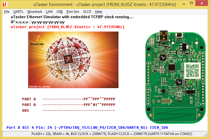 - uTaskerV1.4.8_BM_FRDM_KL05Z_2800.bin KL05 application with command-line menu on the virtual COM connection (115200 Baud) and accelerometer operation (activate output in I2C menu). Low power modes can be set in the application menu and the processor runs at 47.97MHz {FLL} [19.2k]. Linked to 0x2800, it can be loaded using the KBOOT PC tool - 57600 Baud. When the application is running the green LED blinks at 2.5Hz.
