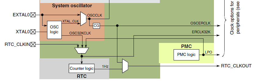 For the reason above the default RTC clock on KL Freedom boards is thus the LPO. If you enable the RTC using SUPPORT_RTC the option RTC_USES_LPO_1kHz is valid by default. Should you modify the board or configure for your own that does have an external oscillator on RTC_IN you can select RTC_USES_RTC_CLKIN instead (as the tower board configurations do). The accuracy of the RTC driven from the LPO is of course not very high since the LPO, although it is trimmed and can be further trimmed in the circuit, is not so good or stable as a crystal source. If designing circuits with the KL devices that need a RTC it is therefore recommended to use a tower board's circuit as reference and add a good quality low power oscillator to drive the RTC which will then allow accuracy and low power modes to be used sucessfully.